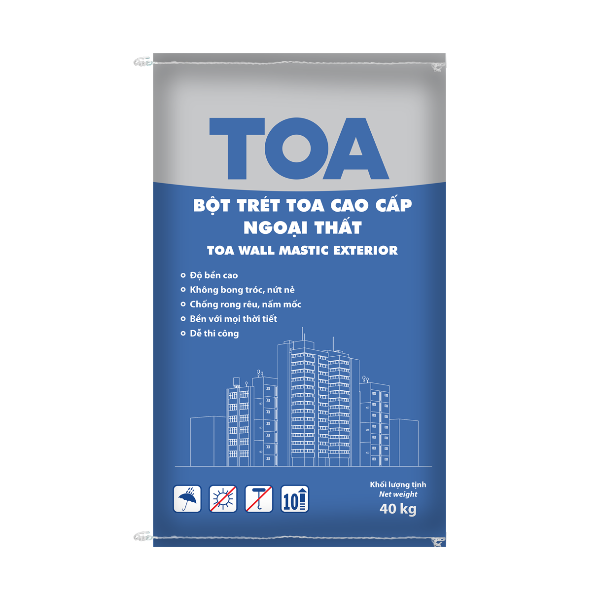 - Để có bề mặt nhẵn mịn, sử dụng 2 lớp bột trét TOA cao cấp ngoại thất.