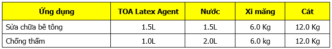 Pha TOA Latex Agent : nước sạch theo tỉ lệ khối lượng 1:3 (1) với hỗn hợp xi măng : cát theo tỉ lệ khối lương 1:3 (2). Rót hỗn hợp (2) vào hỗn hợp (1) khuấy đều đến khi đạt được độ sệt thi công.